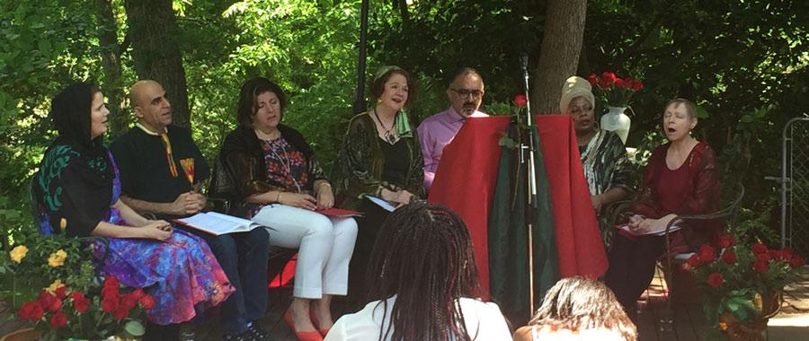 Ridvan has been my favorite Baha’i Holy Day to commemorate, and over the course of the last 30 years, I’ve put together many programs, working with my husband Tim, who is skilled with technical aspects of theatre, and many other talented friends — musicians, dancers, readers, costume makers, and technical assistants. Some have been quite large; in one case, over 700 people came! In another case, we had a live horse in the procession. Artistic elements such as music, dance, costumes, lighting, scenic backgrounds, the sounds of birds and water, and of course roses have been used to depict a sense of what that time period was like.